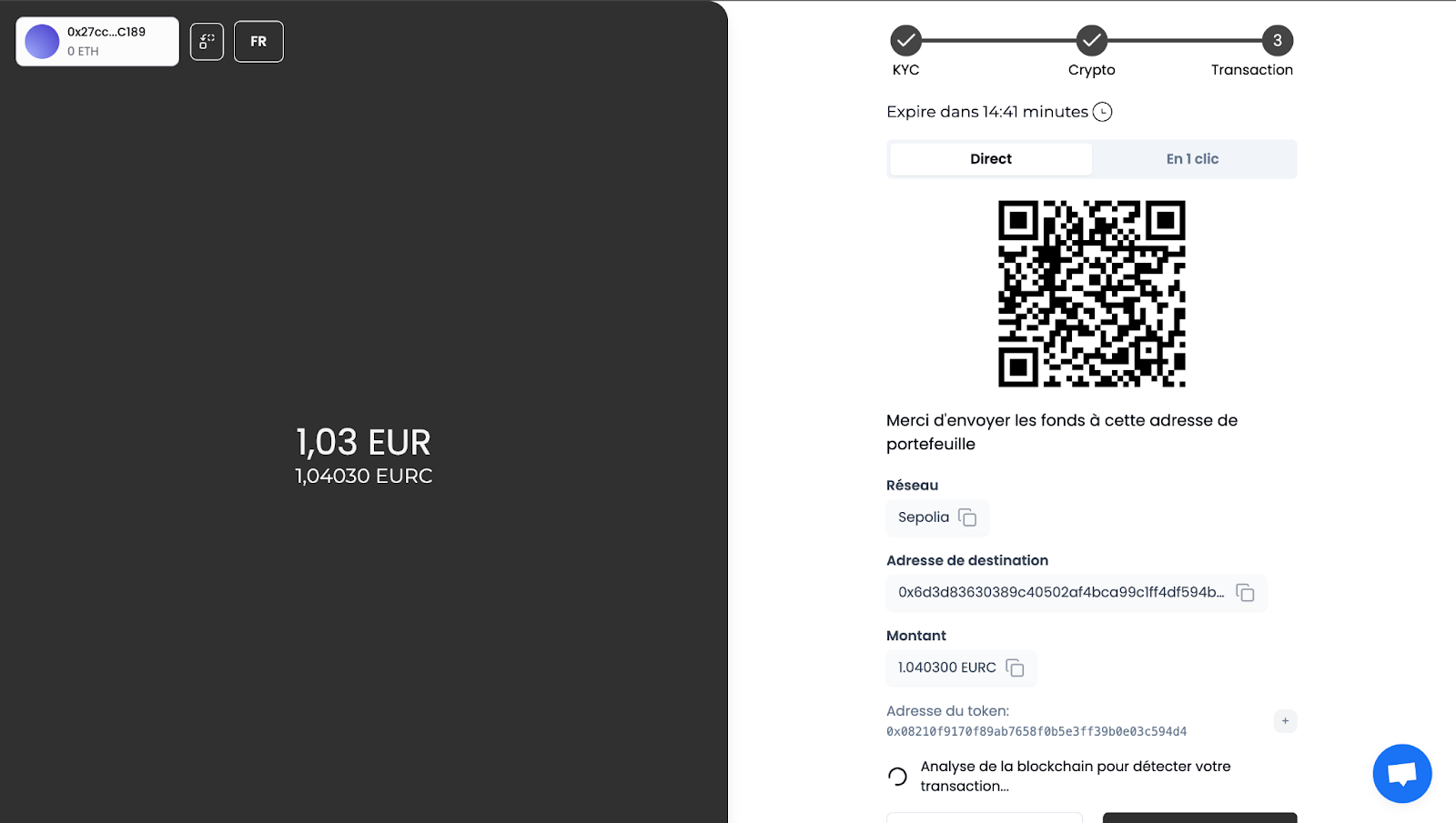 Ici, nous avons choisi d’utiliser le réseau Sépolia Ethereum (test), et de dépenser de l’EURC.